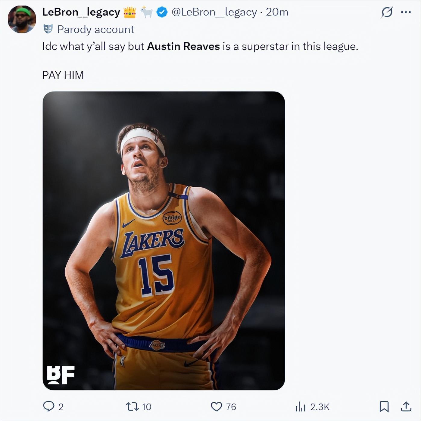 奥斯汀-里夫斯实在是太出色了,末节开场湖人还在落后,但在短短1分06秒的时间里里夫斯一人打出了8-0的攻势直接帮助湖人反超,湖人队记迈克-特鲁戴尔都觉得不可思议。